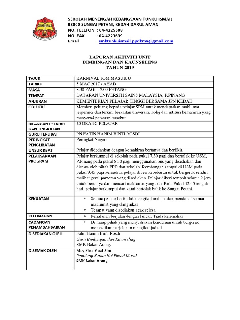 900 pagi - 600 petang Semenanjung Malaysia 830 pagi - 530 petang Sabah Sarawak. Rosilavi Mat Jusoh Published. The Jom Masuk U programme hopes to retain its 100-per cent success rate in assisting and arranging for Belaga youths to further into tertiary studies for the third conservative year.